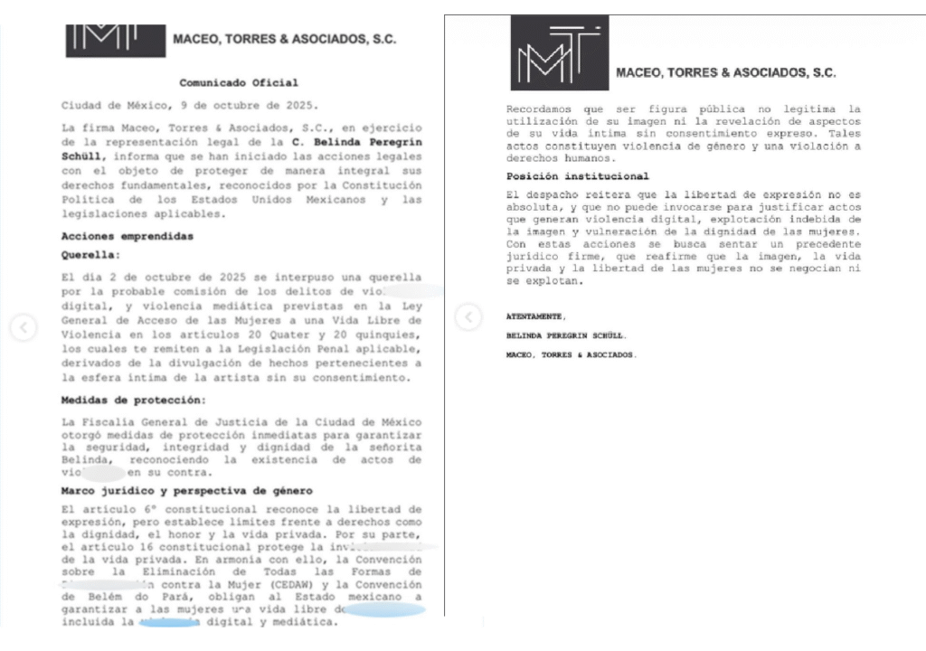 En un comunicado emitido por la firma Maceo, Torres & Asociados, S.C., se informó que el 2 de octubre de 2025 se interpuso la querella ante la Fiscalía General de Justicia de la Ciudad de México.